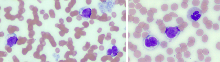 The images above are from a fresh smear. It shows beautiful intact blast cells on the left. The image on the right is taken in the tail of the smear and shows cells damaged during the smearing process.